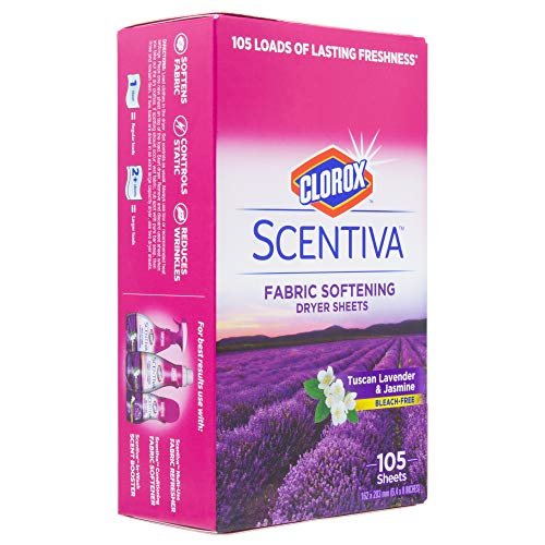 Indulge your home with Clorox Scentiva. Clorox Scentiva will keep your household clean while filling your home with uplifting, inviting, and long-lasting scents. Scentiva fragrances are carefully curated to freshen and invigorate your home and transform your cleaning experience. Clorox Scentiva Fabric Softening Dryer Sheets contain 105 dryer sheets for use in your dryer and around the home.DIRECTIONS: Load clothes in the dryer. Set controls as usual. Always use low or recommended heat settings. Place one new sheet on top of the load. Start dryer. Remove and discard used sheet when you take out the dry clothes. If spotting should occur, wet fabric, rub spot with pure bar soap, then rinse and rewash item. If two loads are dried in an extra large capacity dryer, use two dryer sheets. Ingredients include fabric softening agents and perfume blended on a non-woven fabric. WARNING: Keep out of reach of children. Not for use on garments labeled as flame resistant as it may reduce flame resistance.