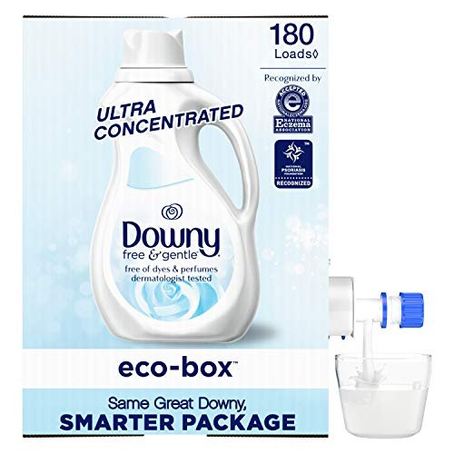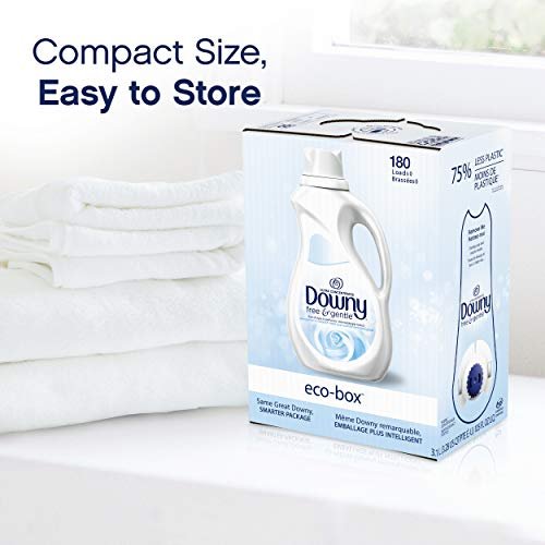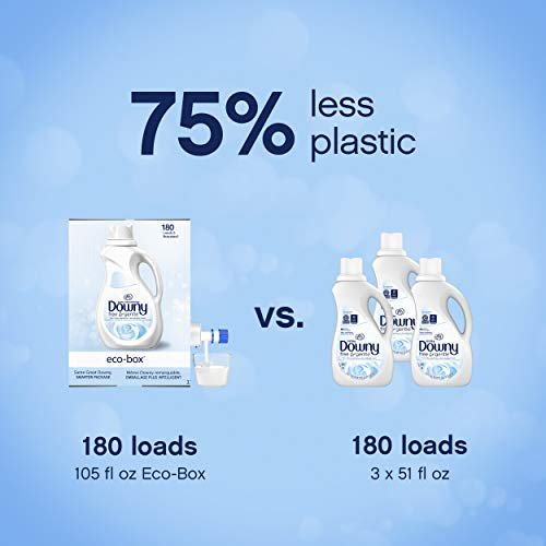Downy eco-box is the same liquid Fabric Softener that you love, now in smarter package! Made with 30% less water, its re-engineered formula gives you more softening power per drop than Downy Original liquid Fabric Softener, plus it’s hypoallergenic, Dermatologist Tested, and free of dyes and perfumes. Smaller and easier to store, it’s compressed into a shipping-safe package Made from 75% less plastic and features a no-drip tap to help minimize any leaks and spills. To assemble The Downy eco-box liquid Fabric enhancer, simply pull the tab on the side of the pack to reveal the tap and dosing cup. But the best part: it’s easy to use! All you have to do is twist the blue knob counterclockwise to dispense the desired amount of laundry softener into the dosing cup. Make sure to twist slowly so the softener doesn’t come out too quickly. Per oz vs. 2 x 51 oz bottles Downy Free & Gentle Liquid Fabric conditioner (Fabric Softener) eco-box, he compatible, 105 fl oz 180 loads