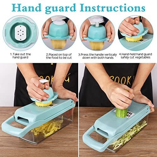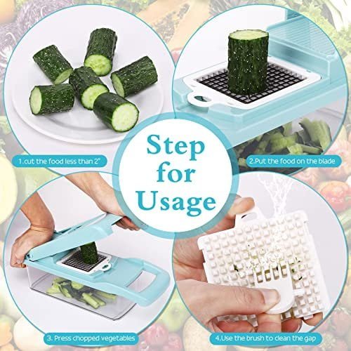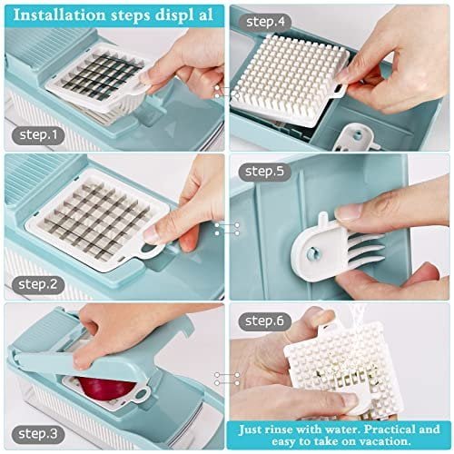 【SAFE TO USE and QUALITY ASSURANCE 】With this vegetable chopper Blades are ultra sharp, Please be in strict accordance with the instruction and pay attention when assemble or disassemble. Avoid installing violently and using blades on inappropriate ingredients, which leads to blades bend or damage. No putting blades randomly, after rinsing and drying, pls collect them into the container and keep them away from children and please washing alone ,do not put into washiing machine!!