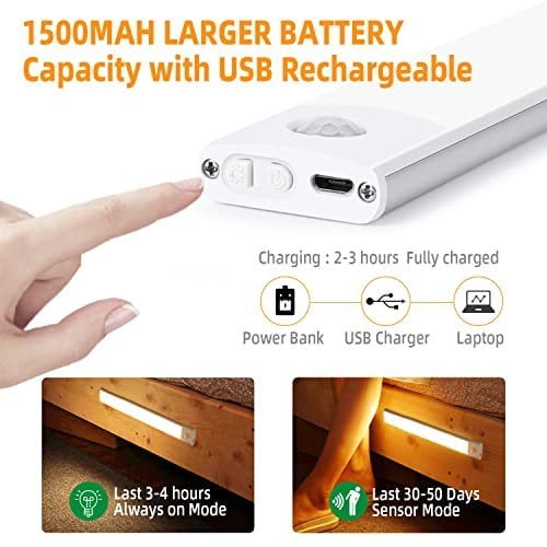 💡【USB Rechargeable and Energy Saving】Our LED battery operated lights are built-in with a 1500mAh high-capacity rechargeable battery, easily charged via the USB cable (included). After fully charged, the wireless under cabinet lighting can last for about 3 hours when you make it (ON) mode and 4-8 weeks under motion sensor mode (activated 5-8 times a day).