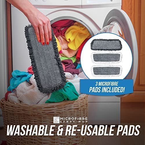 Reusable Washable Microfibre Pads – The spray mop comes with 3 reusable replacement microfibre pads. With its advanced design, it can easily remove dust, hair and animal fur on the ground. The raised cotton thread on the edge of mop cloth can easily clean the narrow corners and protect your vulnerable furniture. The top-grade microfibre mop pads are perfect for wet cleaning and can efficiently tackle even the toughest cleaning jobs. The replacement pads are 100% machine washable and reusable.