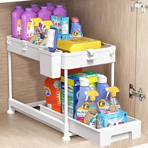 【Space-saving & Neatly Organized】 This under cabinet sliding storage basket makes full use of cabinet space. Kitchen under sink for holding dish-washing liquid, cloth and small items. Bathroom under sink for storing shampoo, shower gel, cosmetics, etc. Making bottles and jars more orderly under the sink.